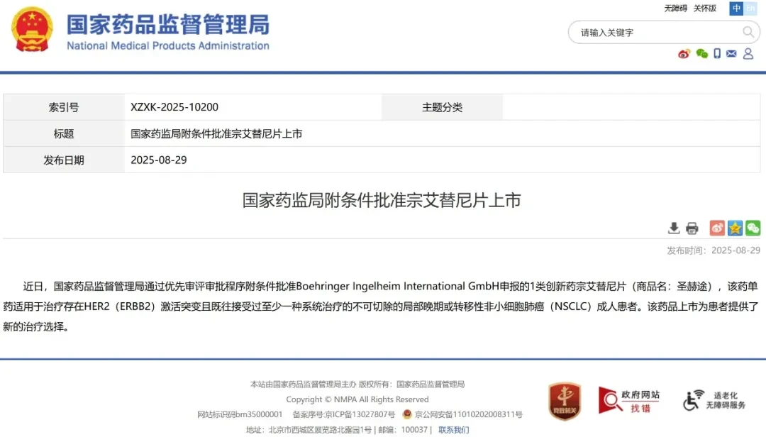 On August 29, 2025, Boehringer Ingelheim's innovative lung cancer drug—Zongaitini Tablets (also known as Zonggetini)Approved for conditional marketing authorization by China's National Medical Products Administration (NMPA) through the priority review and approval procedure.!For use withPresence of HER2 (ERBB2) activating mutations and previously received at least one systemic treatment for unresectable diseaseLocally advanced or metastatic non-small cell lung cancer (NSCLC)Adult patienttreatment.