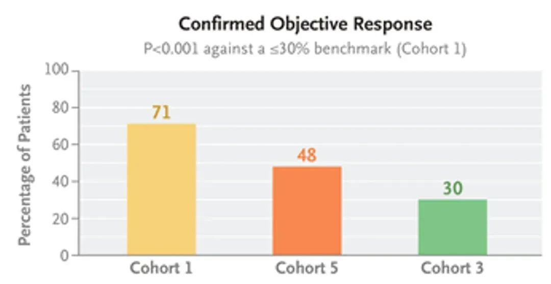 The results show: as of the data cutoff, Cohort 1 has been confirmedThe objective response rate (ORR) reached 71%.(95%CI:60-80),Median duration of response was 14.1 months(95% CI: 6.9 - not evaluable),The median progression-free survival (PFS) was 12.4 months.(95%CI: 8.2-unable to evaluate); Cohort 5 confirmedThe ORR was 48%.(95%CI: 32-65); Cohort 3Confirmed ORR is 30%(95% CI: 15-52) (see figure below).